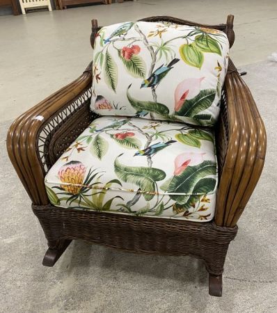 Bamboo style wicker rocker, bird fabric, good condition. Bamboo style wicker rocker, bird fabric, good condition.