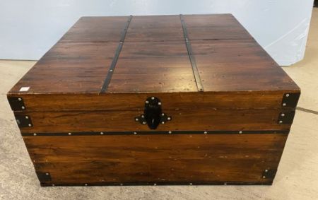 Vintage Large Coffee Table Storage Box, lift top, metal bands and latch, has usage wear, 17"h., 36"w. Vintage Large Coffee Table Storage Box, lift top, metal bands and latch, has usage wear, 17"h., 36"w.