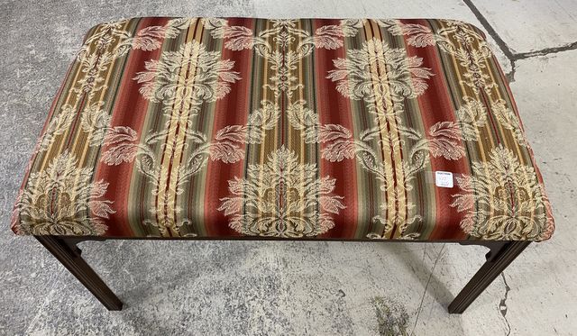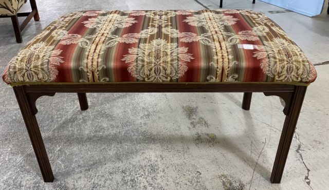 Vintage Chippendale bench, cherry, floral upholstered cushion, 18"h., 33"w. Vintage Chippendale bench, cherry, floral upholstered cushion, 18"h., 33"w.