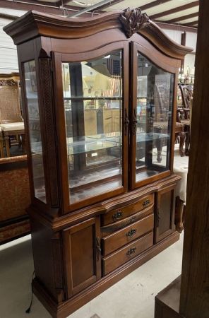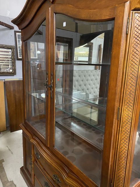 Reproduction French Style Cherry China Cabinet, two piece, glass doors, mirrored back, glass shelves, base with drawers and doors, lighted, good condition, 85"h., 60"w., 18"d. Reproduction French Style Cherry China Cabinet, two piece, glass doors, mirrored back, glass shelves, base with drawers and doors, lighted, good condition, 85"h., 60"w., 18"d.