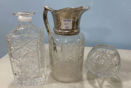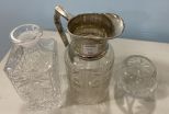 Etched Glass Pitcher, silver plated rim with handled, etched glass designs 8 1/2"h, Pressed Glass Decanter, Hobstar, missing stopper, and Vase, hobstar design. Etched Glass Pitcher, silver plated rim with handled, etched glass designs 8 1/2"h, Pressed Glass Decanter, Hobstar, missing stopper, and Vase, hobstar design.