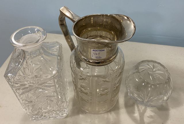 468 Etched Glass Pitcher, Pressed Glass Decanter, and Vase