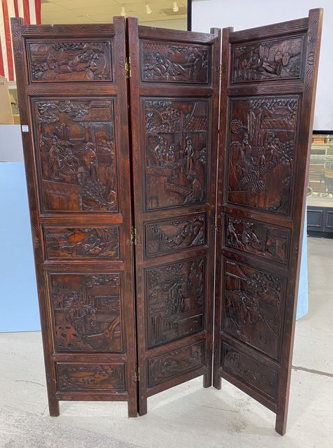 Chinese Wood Carved Room Divider/Dressing Screen, three panel, carved artwork, each panel is 75"h., 18"w. Chinese Wood Carved Room Divider/Dressing Screen, three panel, carved artwork, each panel is 75"h., 18"w.