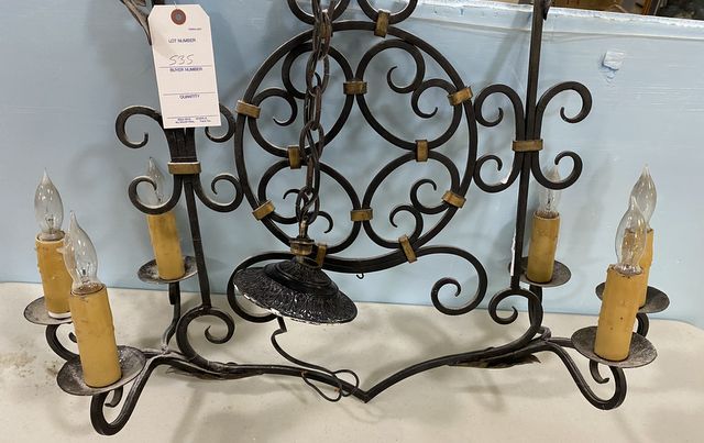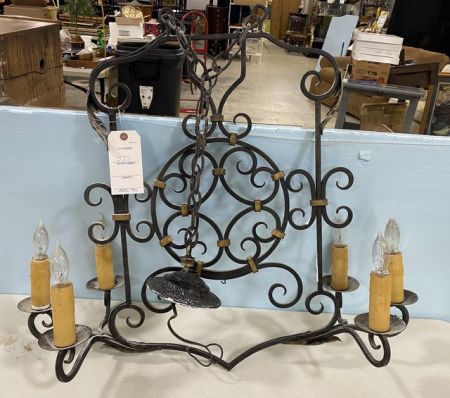 Wrought Iron Hanging Light fixture, 6 arm, candle stick lights, used, working condition, 28"h., 32"w. Wrought Iron Hanging Light fixture, 6 arm, candle stick lights, used, working condition, 28"h., 32"w.