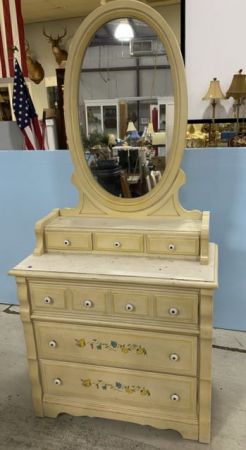 Dixie Co. Martha Washington Single Dresser, modern, factory painted, drawers with white knobs, oval top mirror, has wear, 76"h., 36"w., 18"d. Dixie Co. Martha Washington Single Dresser, modern, factory painted, drawers with white knobs, oval top mirror, has wear, 76"h., 36"w., 18"d.