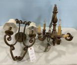Two decorative light fixtures, gold gilt wood five arm light fixture, needs work, one arm light broken, 20"h. and Contemporary Metal Two Arm Wall Sconce. Two decorative light fixtures, gold gilt wood five arm light fixture, needs work, one arm light broken, 20"h. and Contemporary Metal Two Arm Wall Sconce.