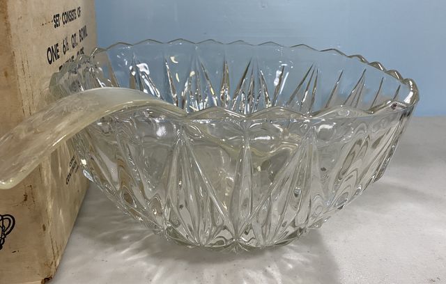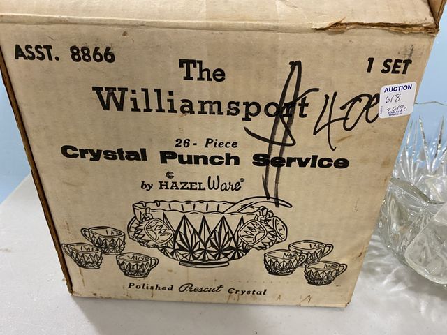 The Williamsport Crystal Punch Set, by Hazel ware, bowl, one 6 1/2 qt., 12 cups, 12 hooks, one ladle, in box. The Williamsport Crystal Punch Set, by Hazel ware, bowl, one 6 1/2 qt., 12 cups, 12 hooks, one ladle, in box.