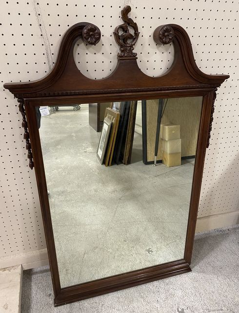 Vintage Broken Pediment Crest Mirror, carved center finial, mahogany, light wear, 45"h., 29"w. Vintage Broken Pediment Crest Mirror, carved center finial, mahogany, light wear, 45"h., 29"w.