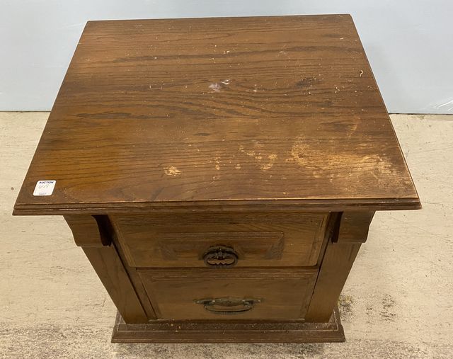 Vintage Oak nightstand, two drawers, has worn spot on top, 24"h., 18"w., 21"d. Vintage Oak nightstand, two drawers, has worn spot on top, 24"h., 18"w., 21"d.