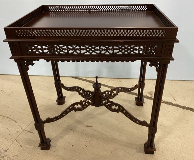 Indo Reproduction Chinese Chippendale Side Table, gallery top, cherry, good condition, 27"h., 24"w. Indo Reproduction Chinese Chippendale Side Table, gallery top, cherry, good condition, 27"h., 24"w.