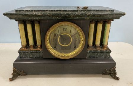 Vintage Seth Thomas Victorian Bell Style Mantle Clock, has key and pendulum, needs work, 11"h., 16"w. Vintage Seth Thomas Victorian Bell Style Mantle Clock, has key and pendulum, needs work, 11"h., 16"w.