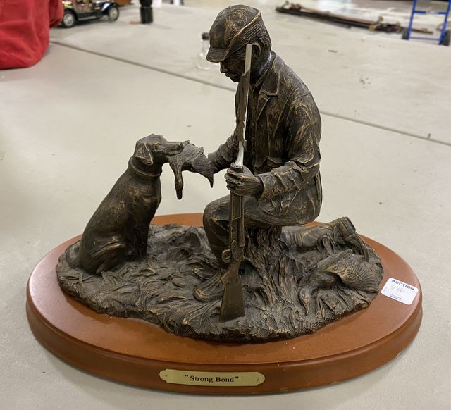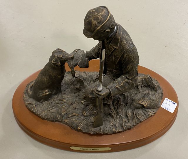 "Strong Bond" Resin Statue, gun barrel has chip, wood base, 10"h., 14"w. "Strong Bond" Resin Statue, gun barrel has chip, wood base, 10"h., 14"w.