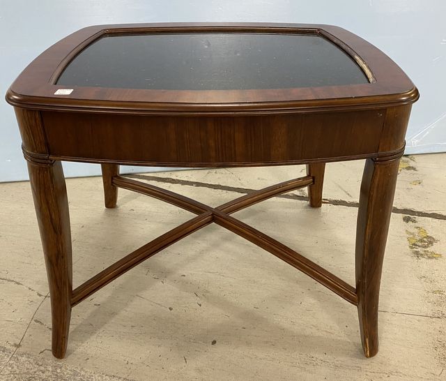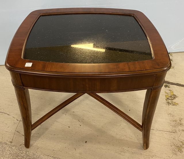 Cherry finish lamp table, glass inset top, light scratches, 24"h., 29"w. Cherry finish lamp table, glass inset top, light scratches, 24"h., 29"w.
