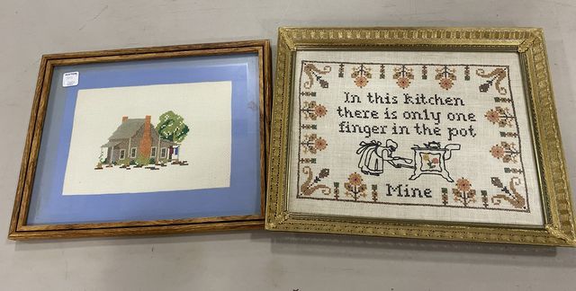 705 Gold Gilt Framed Needlepoint Sampler and Needlepoint Home Place
