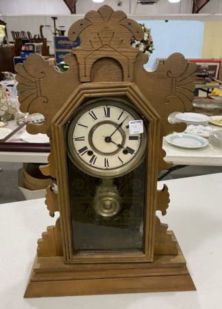 Antique Walnut Victorian Style Mantle Clock, carved, worn finish, glass door, has pendulum, 22"h. Antique Walnut Victorian Style Mantle Clock, carved, worn finish, glass door, has pendulum, 22"h.
