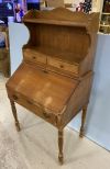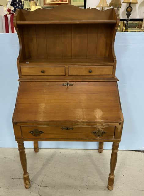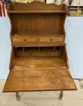 Early American Style Maple Secretary, two piece, drop front writing desk, has worn areas, 55"h., 30"w., 20"d. Early American Style Maple Secretary, two piece, drop front writing desk, has worn areas, 55"h., 30"w., 20"d.
