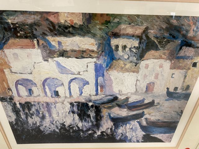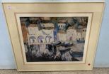 Print of European Town Painting, matted, glassed, framed, 24"h., 28"w. Print of European Town Painting, matted, glassed, framed, 24"h., 28"w.