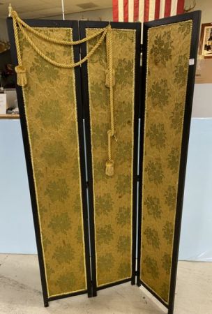 Three Panel Dressing Screen, black frame, gold fabric, tassels, 71"h. Three Panel Dressing Screen, black frame, gold fabric, tassels, 71"h.