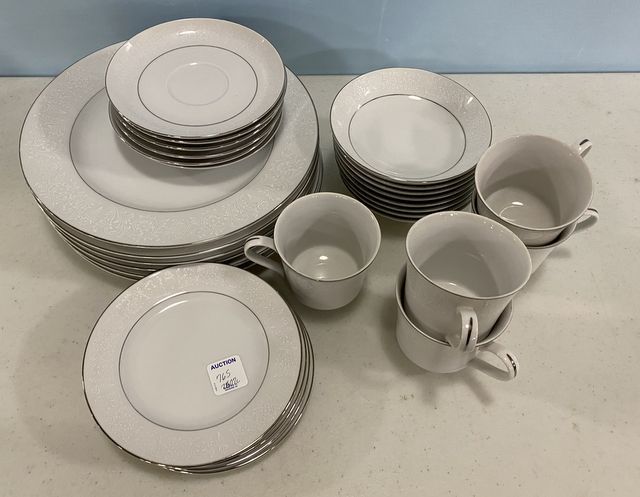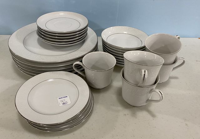 Crown Victoria "Lovelace" China Set, 6 dinner plates, 4 bread & butter, 6 saucers, 5 cups, 8 berry/dessert bowls. Crown Victoria "Lovelace" China Set, 6 dinner plates, 4 bread & butter, 6 saucers, 5 cups, 8 berry/dessert bowls.