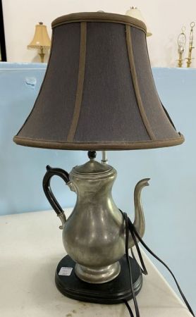 Vintage Tea Pot Table Lamp, wood base, with shade, 20"h. Vintage Tea Pot Table Lamp, wood base, with shade, 20"h.