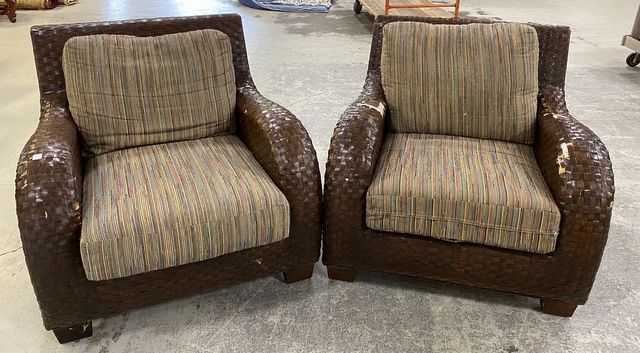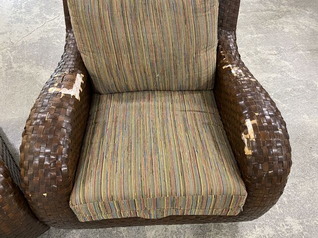 Pair of Spilt Oak Woven Patio Arm Chairs, has cushions, chairs have damage. Pair of Spilt Oak Woven Patio Arm Chairs, has cushions, chairs have damage.