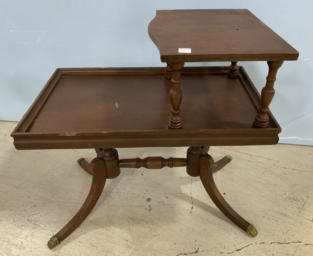 Mahogany Vintage Step Up Side Table, Duncan Phyfe, brass cap feet, piece needs work, 24"h., 25"d. Mahogany Vintage Step Up Side Table, Duncan Phyfe, brass cap feet, piece needs work, 24"h., 25"d.