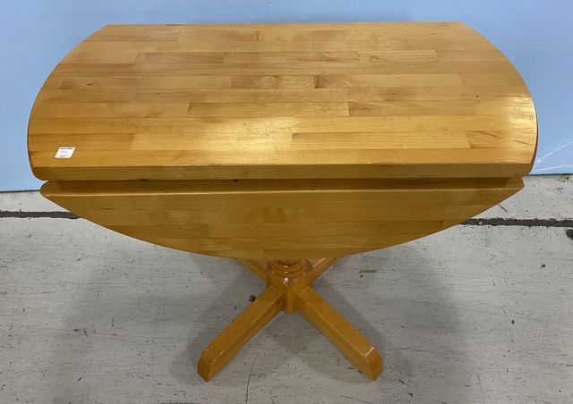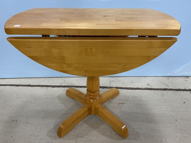Small Pine Drop Leaf Table, pedestal base, good condition, modern, oval, 29"h., 36"w. Small Pine Drop Leaf Table, pedestal base, good condition, modern, oval, 29"h., 36"w.
