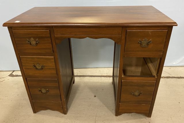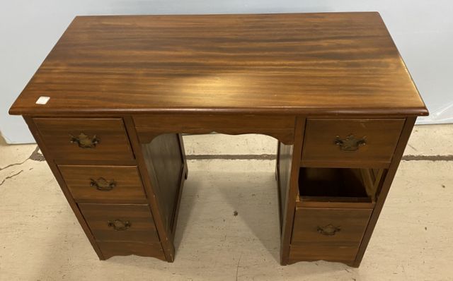 Small Mahogany Kneehole Desk, 5 drawers, missing one drawer, light wear, 30"h., 38"w., 18"d. Small Mahogany Kneehole Desk, 5 drawers, missing one drawer, light wear, 30"h., 38"w., 18"d.
