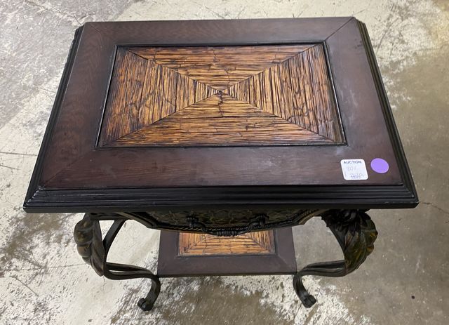 Small decorative side table, metal frame, single drawer, two tier, good condition, 22"h., 17"w. Small decorative side table, metal frame, single drawer, two tier, good condition, 22"h., 17"w.
