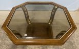 Vintage Oak Finish Coffee Table, beveled glass top, wood with brass accent pieces, polygon top, 16"h., 38"w. Vintage Oak Finish Coffee Table, beveled glass top, wood with brass accent pieces, polygon top, 16"h., 38"w.