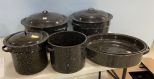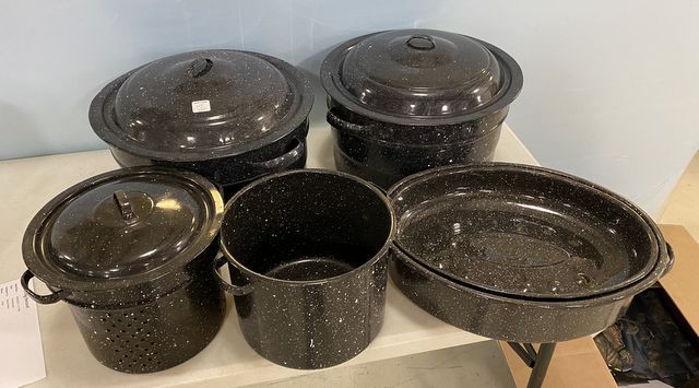 Group of Black Enamel Cookware, 8 quart stock pots with lids, oven rooster with lid, double boiler w/ lid. Group of Black Enamel Cookware, 8 quart stock pots with lids, oven rooster with lid, double boiler w/ lid.