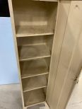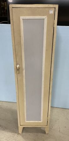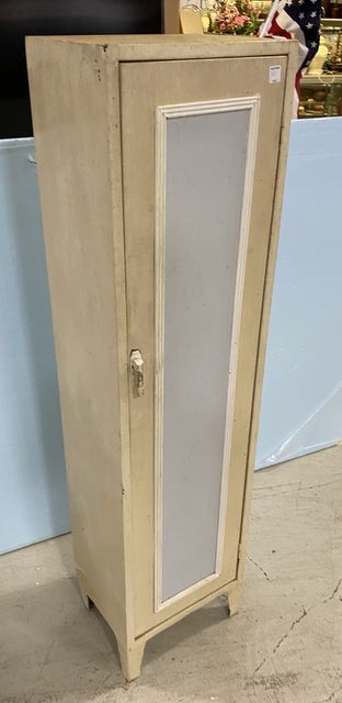 Vintage Metal Single Door Storage Cabinet, interior shelves, hand painted, has age wear, 57"h., 14"w. Vintage Metal Single Door Storage Cabinet, interior shelves, hand painted, has age wear, 57"h., 14"w.