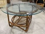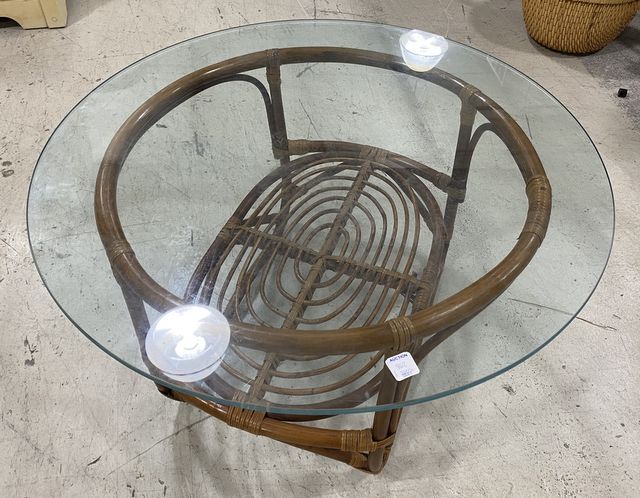 Bamboo style round coffee table, glass top, 16"h., 30"dia. Bamboo style round coffee table, glass top, 16"h., 30"dia.