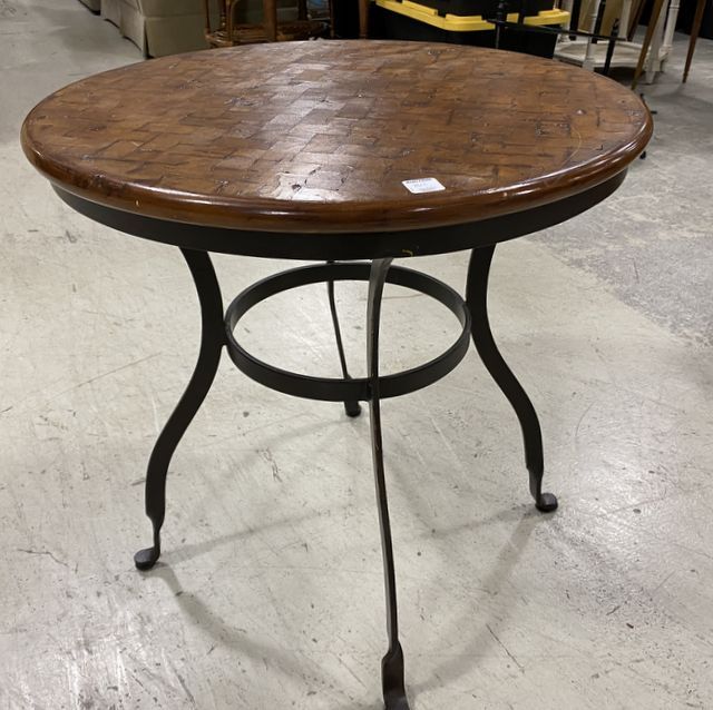 Modern Round Lamp table, metal base, wood style round top, light wear, 24"h., 23"dia. Modern Round Lamp table, metal base, wood style round top, light wear, 24"h., 23"dia.