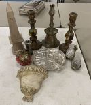 Pair of Ceramic candle holders, brass candle holder, Peace dove wall pocket, silver plate leaf dish, salt & pepper. Pair of Ceramic candle holders, brass candle holder, Peace dove wall pocket, silver plate leaf dish, salt & pepper.