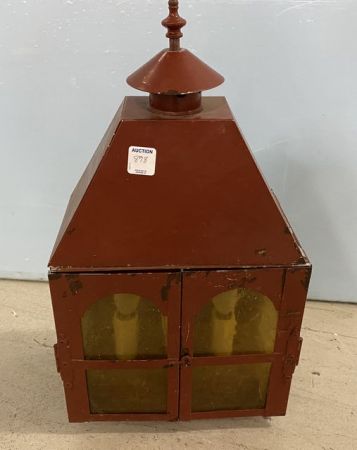 Red Painted Metal Wall Lantern Fixture, three light candle stick, aged, 18"h. Red Painted Metal Wall Lantern Fixture, three light candle stick, aged, 18"h.