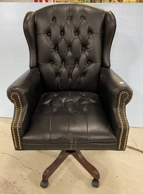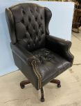 Navy Blue Leather Office Chair, button tufted, swivel on wheels, light wear. Navy Blue Leather Office Chair, button tufted, swivel on wheels, light wear.