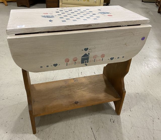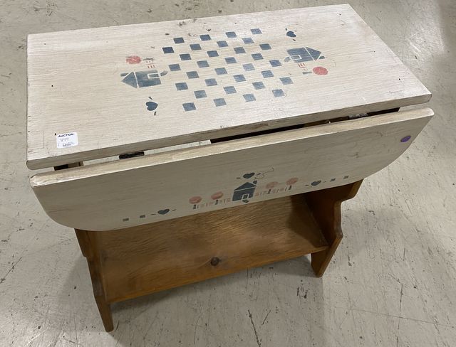 Primitive style drop leaf table, painted top, two tier, 25"h., 24"w. Primitive style drop leaf table, painted top, two tier, 25"h., 24"w.
