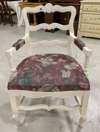 White painted French style arm chair, fabric cushion. White painted French style arm chair, fabric cushion.