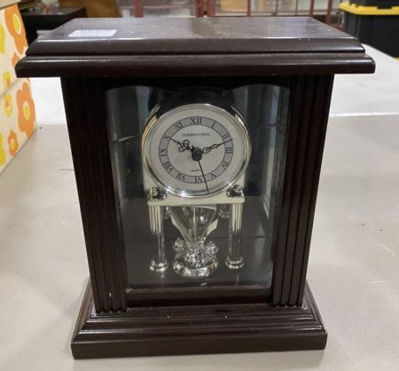 International Mantle Clock, cherry case, glass, battery operated, 9"h., 8"w. International Mantle Clock, cherry case, glass, battery operated, 9"h., 8"w.