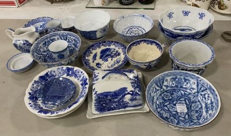 Large Group of Blue and White Pottery Pieces, bowls, creamer, cups, plates. Large Group of Blue and White Pottery Pieces, bowls, creamer, cups, plates.