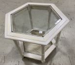White Painted Octagon side table, glass insert, two tier, 21"h., 24"w. White Painted Octagon side table, glass insert, two tier, 21"h., 24"w.