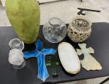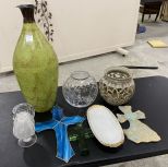 Group of Decorations, metal vase, etched glass bowl, pottery vase, pottery cross, porcelain dish, glass cross, glass bowl. Group of Decorations, metal vase, etched glass bowl, pottery vase, pottery cross, porcelain dish, glass cross, glass bowl.