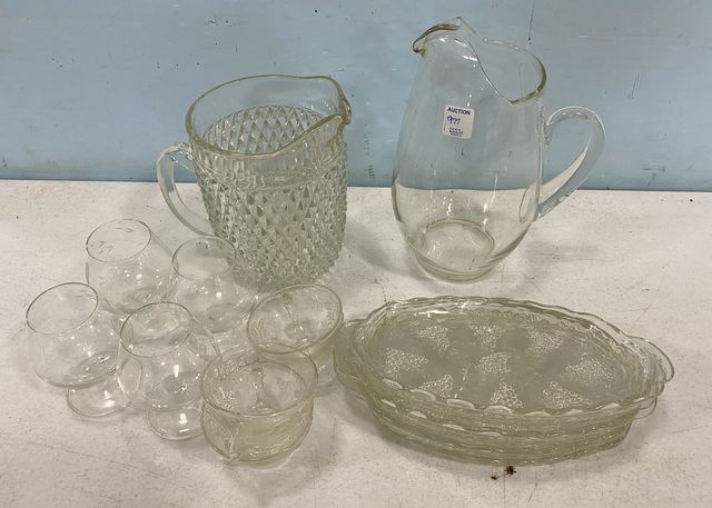 Group of clear glassware, diamond pattery pitcher, clear glass pitcher, luncheon plates and cups. Group of clear glassware, diamond pattery pitcher, clear glass pitcher, luncheon plates and cups.