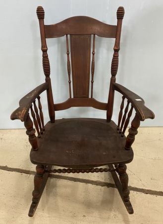 Vintage Early American Style Arm Rocker, ribbed designs, has scratches and wear, loose wear on headrest. Vintage Early American Style Arm Rocker, ribbed designs, has scratches and wear, loose wear on headrest.