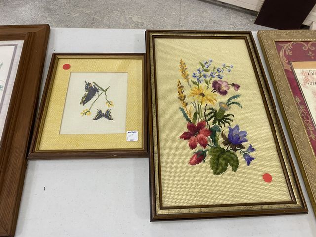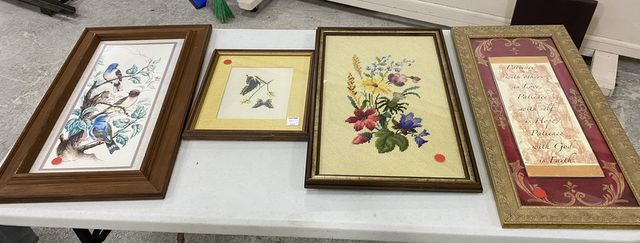Two Needle Points Framed, Bird Print 22"h, and Faith Artwork Print Two Needle Points Framed, Bird Print 22"h, and Faith Artwork Print