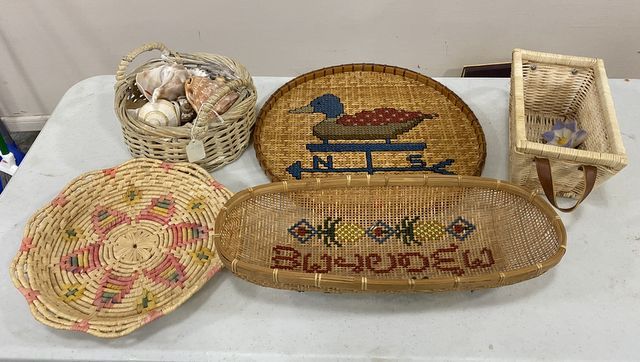 Five Decorative baskets, Round Duck basket, under plate basket, oval basket, woven basket with sea shells. Five Decorative baskets, Round Duck basket, under plate basket, oval basket, woven basket with sea shells.