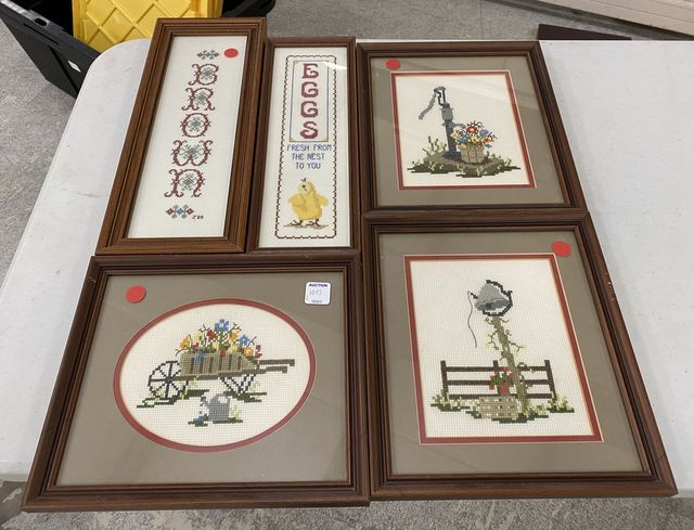 Five Small Needle Point Framed Artwork, framed, Brown, Eggs, Bell, Water Pump, Wagon, 10" x 11". Five Small Needle Point Framed Artwork, framed, Brown, Eggs, Bell, Water Pump, Wagon, 10" x 11".