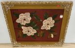 Painted Magnolias on Board, maroon background, vintage gold gilt framed, 21"h., 25"w. Painted Magnolias on Board, maroon background, vintage gold gilt framed, 21"h., 25"w.
