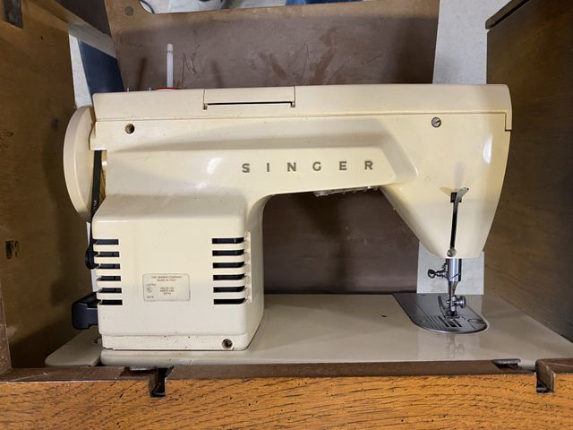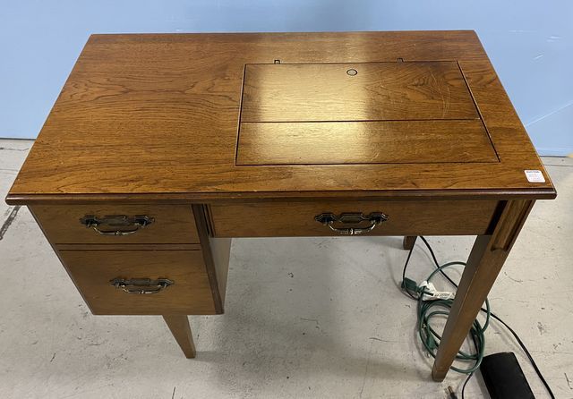 Vintage Singer Sewing Machine in Cabinet, oak finish cabinet, has foot paddle, three drawers, 30"h., 33"w., 19"d. Vintage Singer Sewing Machine in Cabinet, oak finish cabinet, has foot paddle, three drawers, 30"h., 33"w., 19"d.